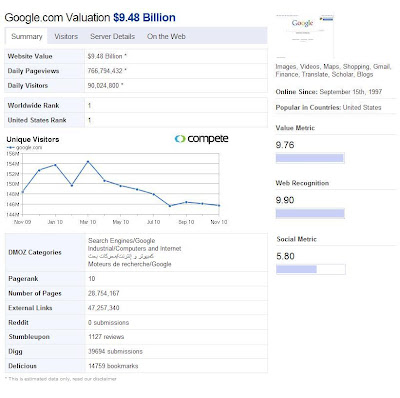 nah berikut ini adalah harga dari google.com yang saya peroleh dari mengetikkan alamat google di sebuah website (http://bizinformation.org/):