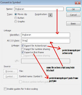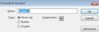 Setelah itu convert gamar lingkaran kita menjadi movie Clip dengan cara Seleksi gambar lingkaran, klik F8 sehingga akan tampil menu convert to symbol seperti berikut :