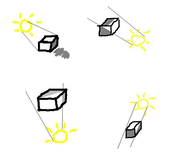 Nah ilustrasi diatas menunjukkan bahwa sinar yang mengenai balok dari sebelah kiri sehingga sisi sebelah kanan balok tertutup atau tidak terkena sinar sehingga mementuk bayangan, nah kira-kira seperti itu pemahaman sederhananya, sehingga kita bisa mengamati gambar dengan permukaan yang tidak rata dan kita bisa mengira-ngira dimana letak bagian yang tidak terkena sinar cahaya :