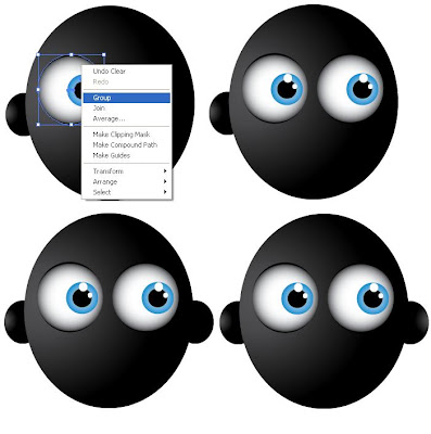 Selanjutnya ungroup kedua mata kemudian seleksi bola mata kanan copy (Ctrl + C) dan Paste to back (Ctrl + B) lalu warnai dengan warna K=90 dan geser keatas, lakukan langkah yang sama untuk mata kiri dengan warna K=100